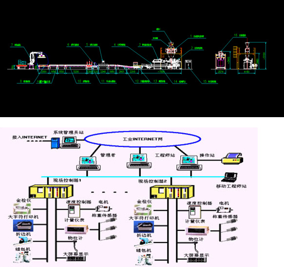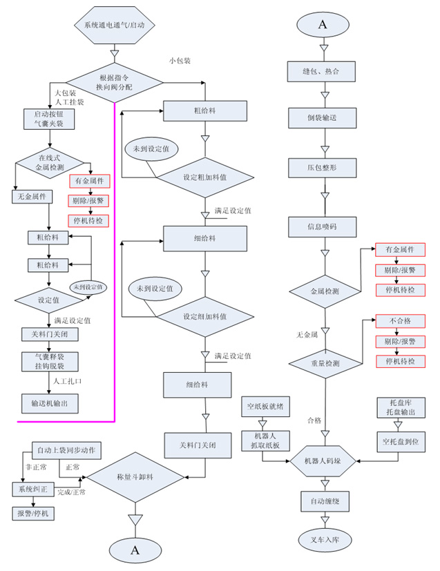 該系統(tǒng)包含了小袋包裝的自動(dòng)上袋、稱重、輸送、封口、倒袋、噴碼、金屬檢測(cè)、重量檢測(cè)、碼垛,大袋稱重包裝及其集散控制系統(tǒng)、信息管理系統(tǒng)。