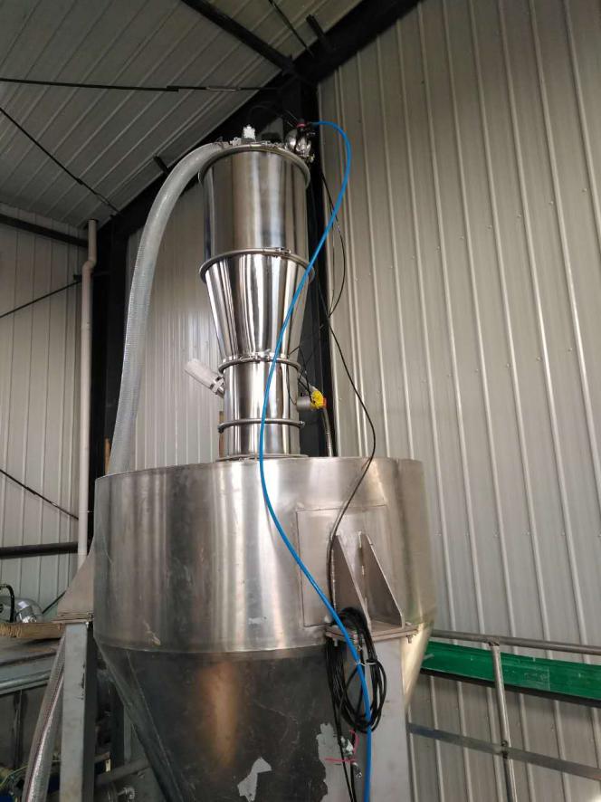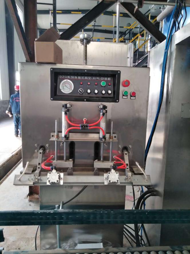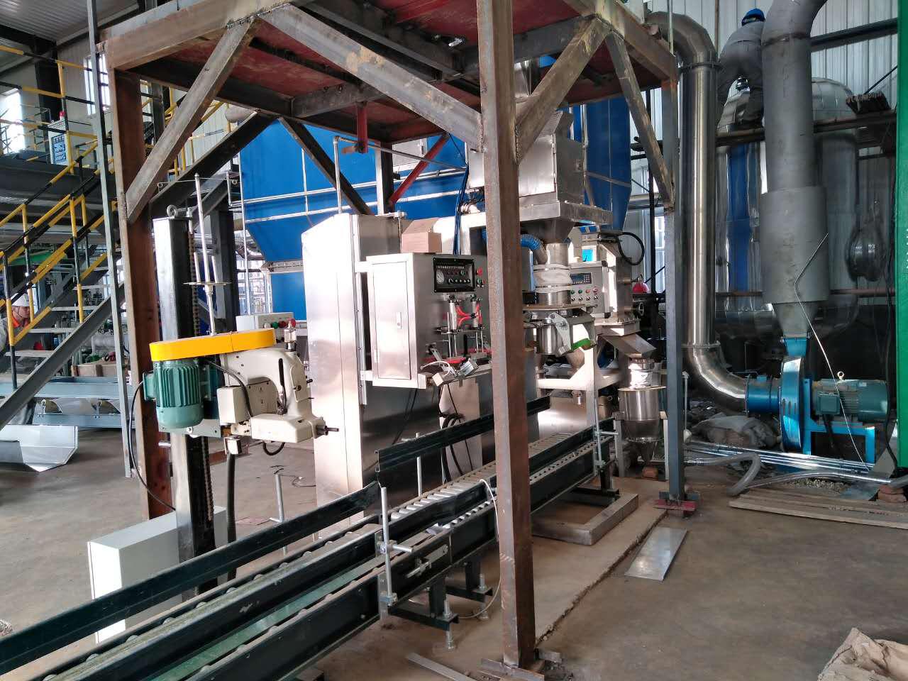 集料分配裝置接收干燥機(jī)組的出料,經(jīng)加速室由負(fù)壓氣力輸送系統(tǒng)輸送至緩存料倉,再通過分料器為包裝機(jī)供料,包裝機(jī)采用特殊夾袋機(jī)構(gòu),配合除塵系統(tǒng)避免揚(yáng)塵。抽真空熱合機(jī)和縫包機(jī)對(duì)滿袋物料進(jìn)行密封封口,配合變頻皮帶輸送機(jī)協(xié)同輸送包裝袋。此套儲(chǔ)運(yùn)、包裝系統(tǒng)在滿足用戶生產(chǎn)需要,提供自動(dòng)化的同時(shí),又大大改善了操作環(huán)境。受到客戶的高度贊揚(yáng)。